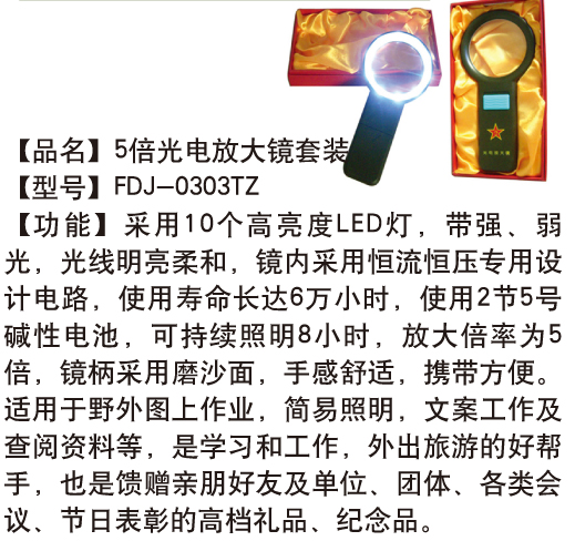 | 配有一个充电器,可将物体放大9倍,可打出放大照明(闪光)三种光线,即可作为军用,也可用来阅读,鉴赏珠宝等。 |